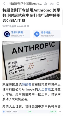美国在袭伊朗时使用Anthropic 人工智能工具 金十数据3月1日讯,在宣布联邦政府将停止使用科技公司 Anthropic开发的人工智能工具几个小时后,美国总统特朗普就利用这些工具对伊朗发动了一次大规模空袭。知情人士证实,包括美国中央司令部在内的各地指挥机构都在使用 Anthropic公司的Claude人工智能工具。尽管该公司与五角大楼之间的紧张关系不断升级,但该指挥部仍使用该工具进行情报评估、目标识别和模拟战斗场景,这凸显了人工智能工具在军事行动中的参与程度。美国政府与Anthropic公司
