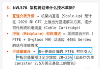 英伟达GTC大会临近,NVL576架构中板(Midplane)材料演进=采用混合材料(PTFE + Q-glass M9) 以适应448G Serdes的信号传输需求,价值量增加20-25%。 NV PCB价值量最大提升方向 终端厂商(如英伟达)在PCB材料方案上经历从PTFE到碳氢+Q布再到第三代PTFE的迭代。此前,前PTFE因加工难度大(需领先PCB厂能加工且加工效果好)难以大规模导入。而根据最新消息,PTFE现已通过英伟达测试,即将放量。 推荐关注沃特股份:公司布局的PTFE薄膜得到了国