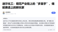 在烟花产业链的图谱上,迪尔化工的位置非常明确且独特:它是硝酸钾等重要原料的规模化供应商。根据公司官方的经营评述,其工业硝酸钾产品是火药、烟花制造的重要原料。与之前分析的许多“潜在关联方”不同,迪尔化工对烟花产业的参与是直接且被确认的。然而,深入探究便会发现,烟花只是其庞大产品应用版图中的一块传统拼图。公司正凭借在硝酸产业链的深度布局,将重心转向更具增长潜力的绿色储能赛道。 01 产业链定位:明确的烟花原料供应商 迪尔化工在烟花产业链中扮演着清晰的上游角色。公司主营业务为硝酸及其下游产品的研发、生