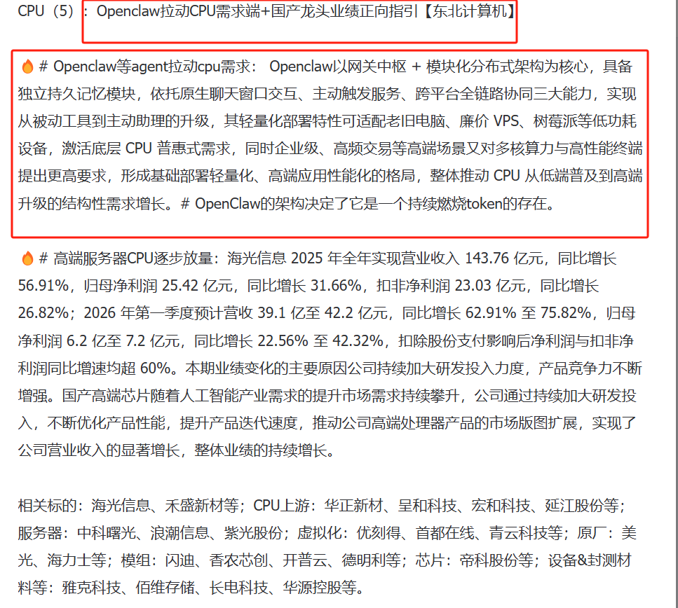 小龙虾越来越火了, 圈里圈外的人都在养小龙虾了, 今天说说CPU在openclaw时代的受益逻辑: Openclaw与AI Agent将大幅度提升A服务器CPU配比,用于AI服务器的高端CPU成本占比26年同比预计增长一倍以上 1. OpenCLaw让CPU参与异构并行计算,强制占用多核与向量单元,算力开销显著上升。 2. AI Agent需自主规划、调度任务,CPU从辅助变调度核心,负载激增。 3. 多Agent并发、工具调用与沙箱运行,大幅提升CPU并发与逻辑控制压力。 4. opencla