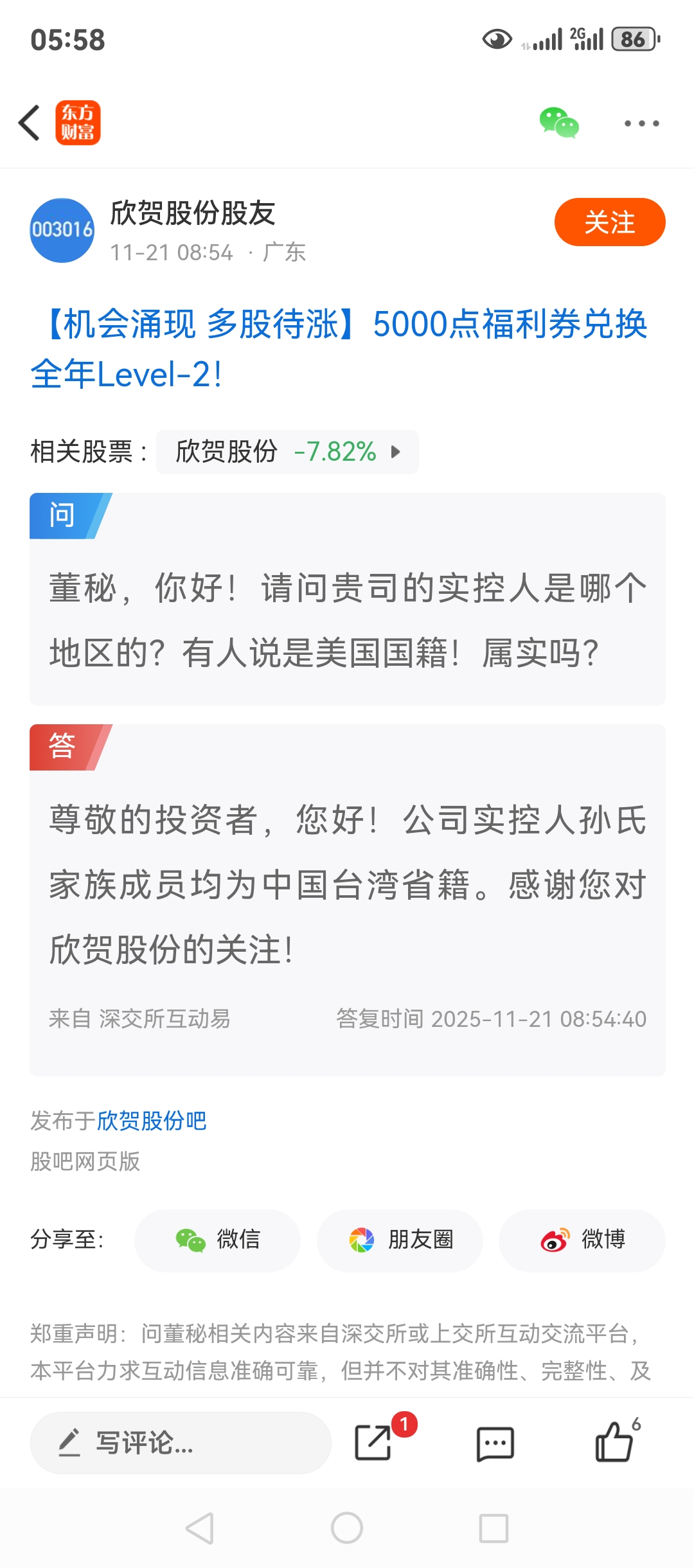 福建省厦门欣贺股份003016实际控制人台湾籍。查看图片