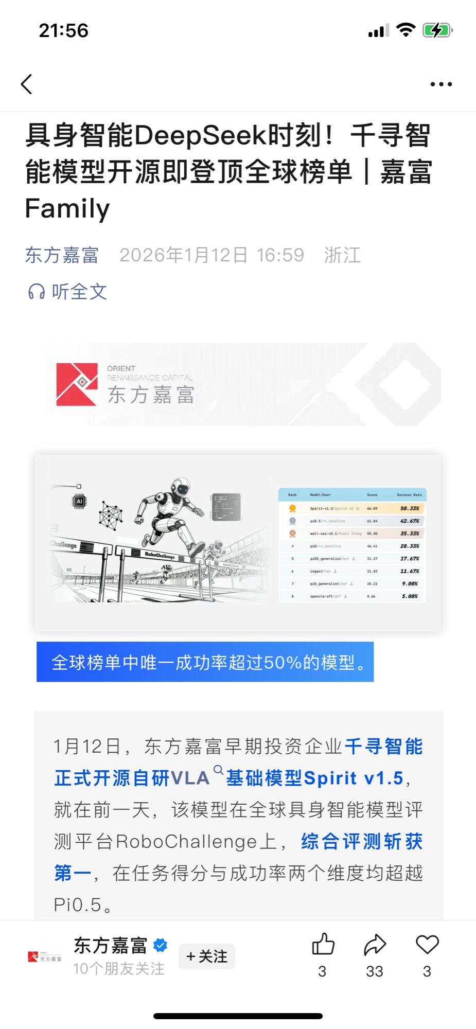 官媒也发出来了,浙江东方战略投资的千寻智能,具身智能模型登顶全球第一!这含金量没人懂吗?官媒已经发了,可以去看一下