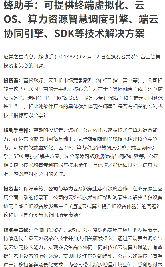 蜂助手方面表示,未来凭借公司在AI大模型融合、数字权益、物联网通信整合等领域的核心优势,将加快落地推出各类AI智能终端,以其为万物互联的关键节点,助力各场景的AI应用落地。