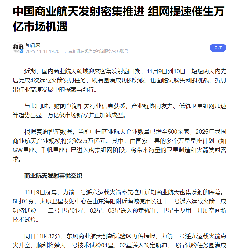 中国商业航天发射密集推进 组网提速催生万亿市场机遇