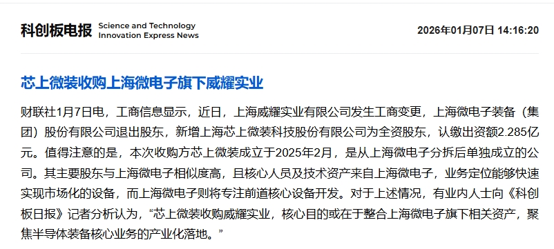 芯上微装收购上海微电子旗下威耀实业