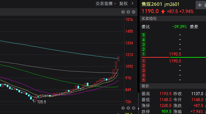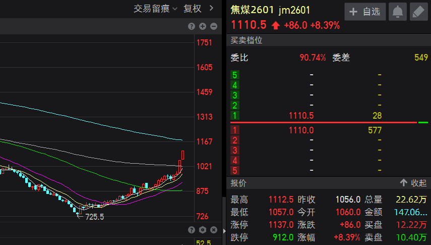 人民财讯7月22日电,7月22日,国内期货市场黑色系再度领涨,午后焦煤、焦炭、多晶硅等多种商品价格报出涨停。截至下午收盘,Wind煤炭指数报涨6.45%,山西焦煤、昊华能源、潞安环能、山煤国际等多只个股收于涨停板。现货市场方面,据Mysteel消息,焦企已经发起第二轮价格提涨。22日,邢台、天津、石家庄、唐山等地区部分钢厂已对湿熄焦炭上调50元/吨、干熄焦炭上调55元/吨,2025年7月23日零点执行。