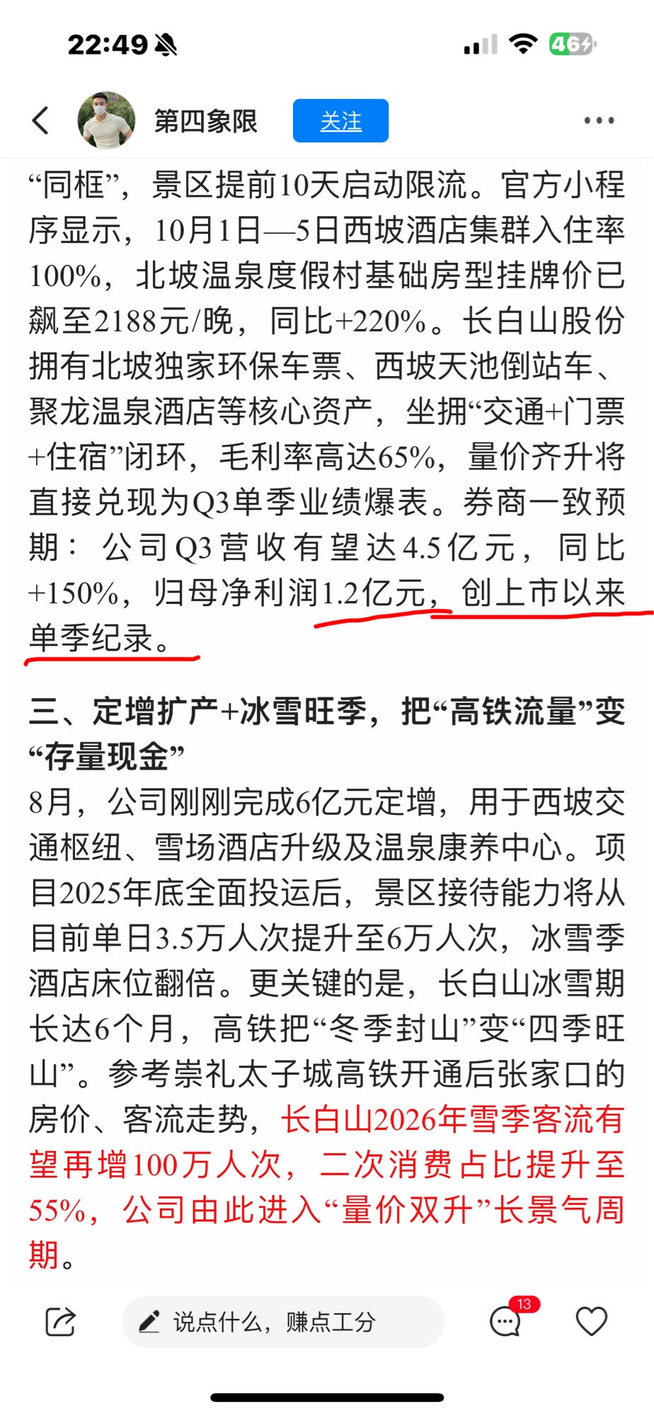 想请问预测第三季度归母净利润1.2亿是不是打错了,去年第三季度1.27亿,今年客流增幅那么多,预测营收4.5亿,创单季纪录,归母净利润却不如去年?