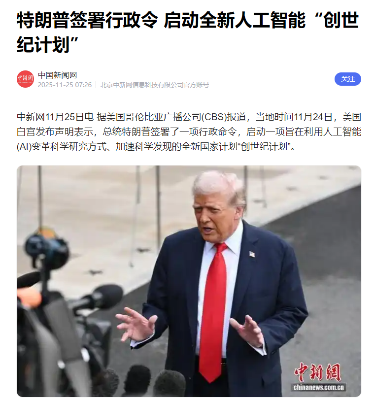 特朗普签署行政令 启动全新人工智能“创世纪计划”