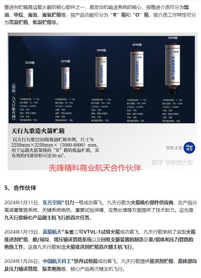 2024年1月26日,中国航天科工快舟试验箭成功首飞,九天行歌提供推进剂贮箱、箭体部段及压力输送管路、泵类绝热等,核心产品再次随主机飞行。