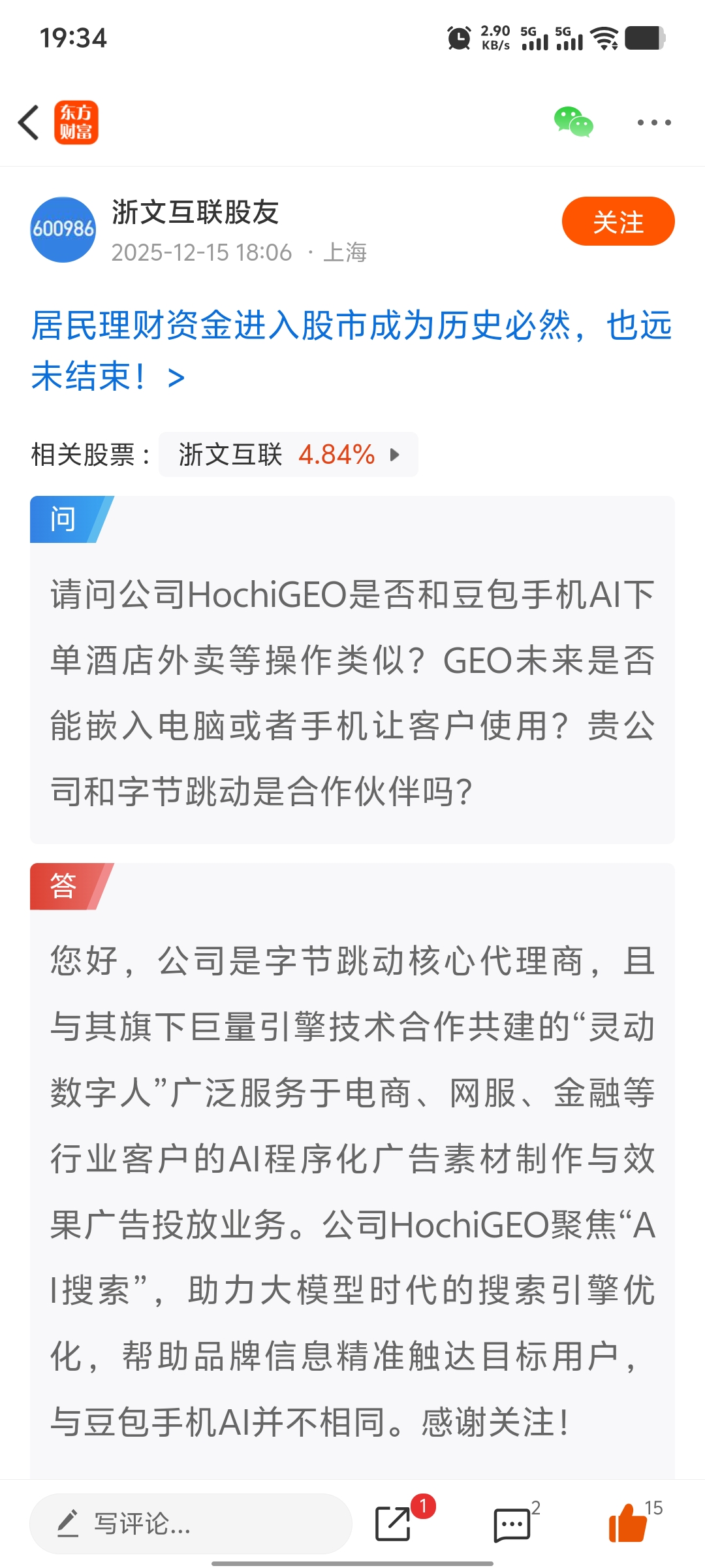 浙文互联是字节跳动核心代理商,且与其旗下巨量引擎技术合作共建的“灵动数字人”广泛服务于电商、网服、金融等行业客户的AI程序化广告素材制作与效果广告投放业务。公司HochiGEO聚焦“AI搜索”,助力大模型时代的搜索引擎优化,帮助品牌信息精准触达目标用户,与豆包手机AI并不相同。感谢关注!