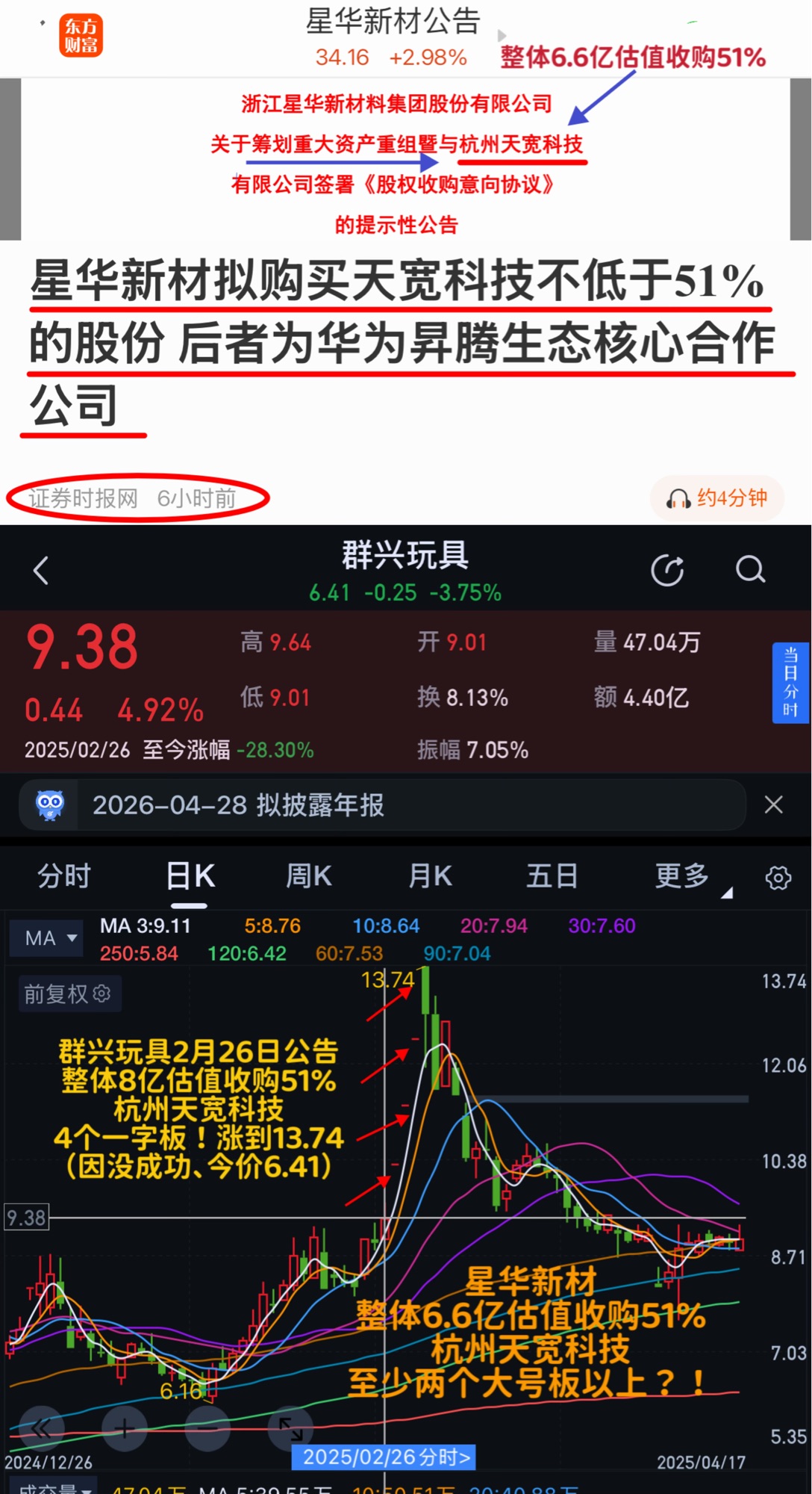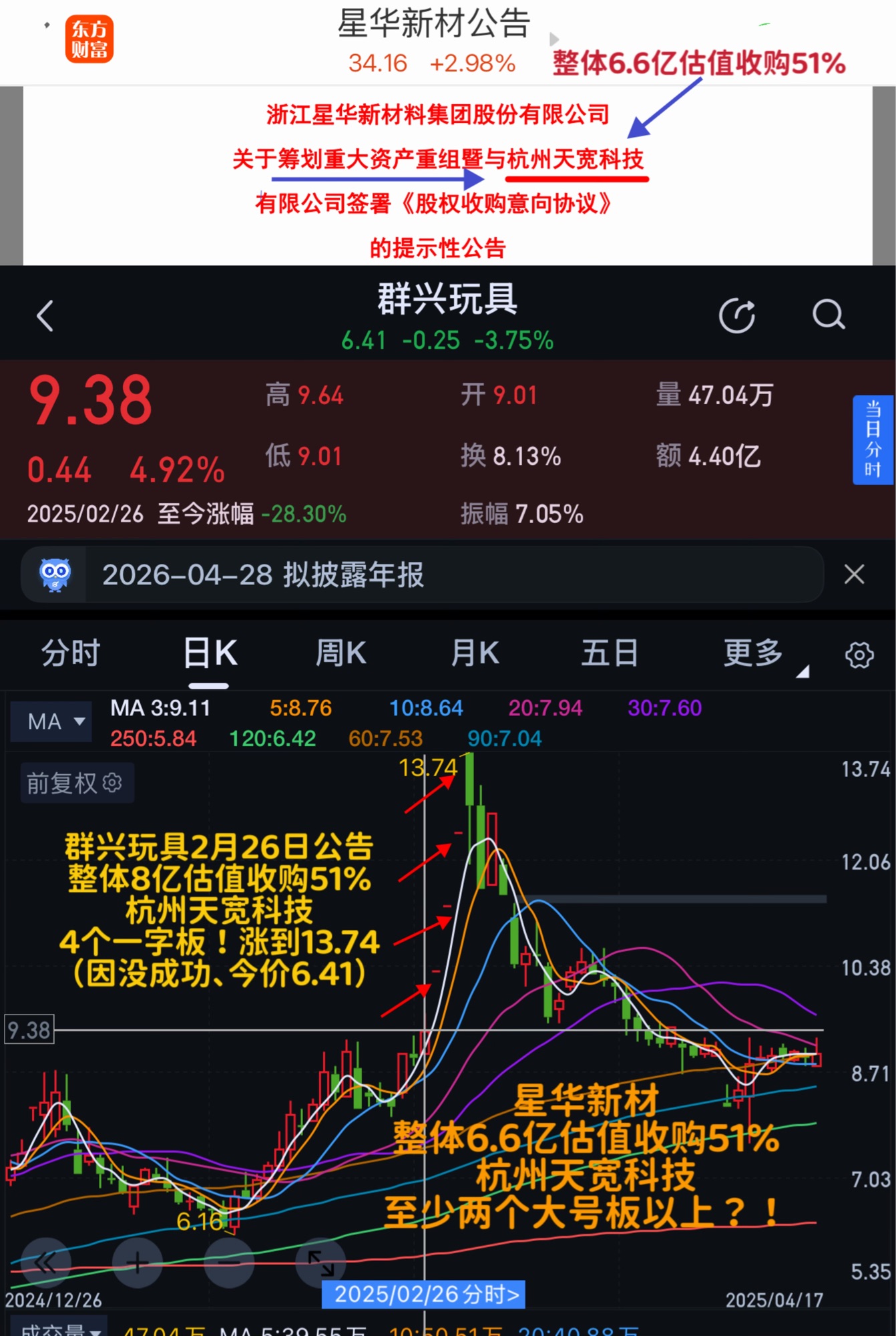 群兴玩具 2月26日公告整体8亿估值收购51%杭州天宽科技,4个一字板、涨到13.74!(因没成功、现价6.41)