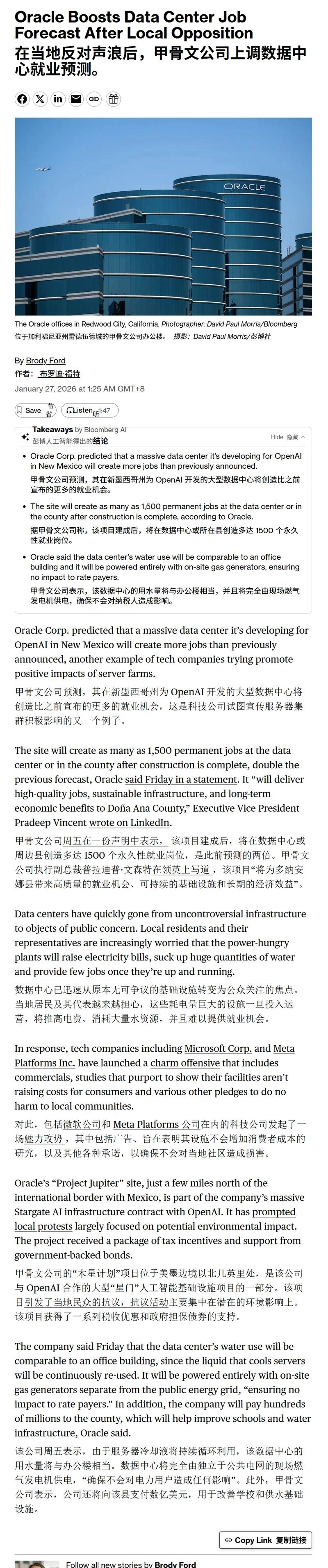 在当地反对声浪后,甲骨文公司上调数据中心就业预测