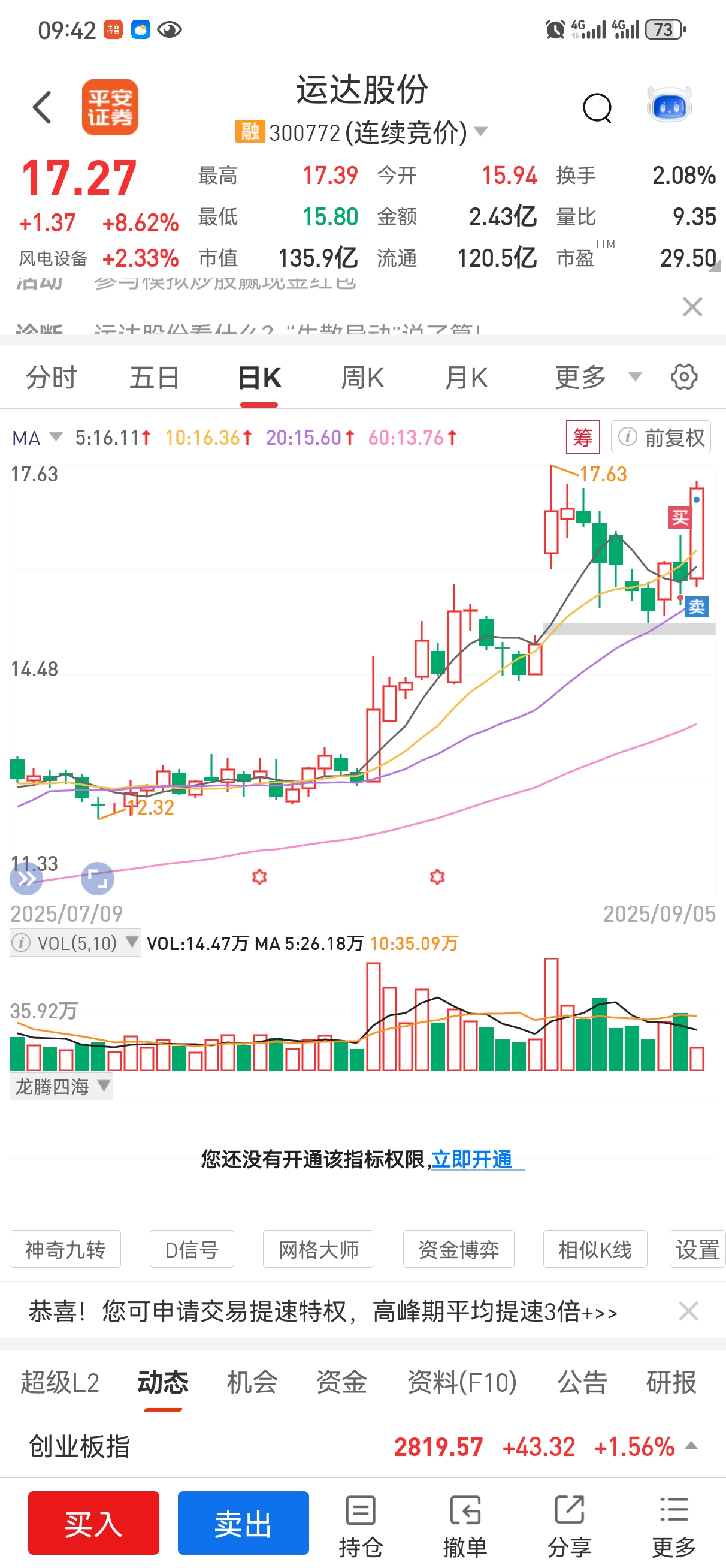 运达本来是计划长线的,涨起来那就先做个短线啰