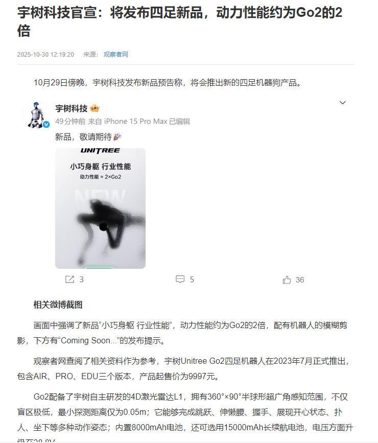 宇树科技全新四足机器人官宣,动力性能超越Go2!