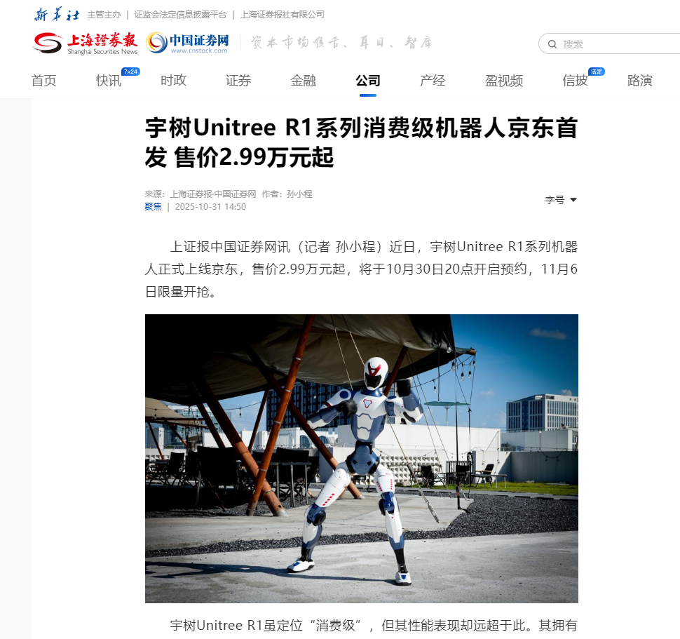 宇树Unitree R1系列消费级机器人京东首发 售价2.99万元起
