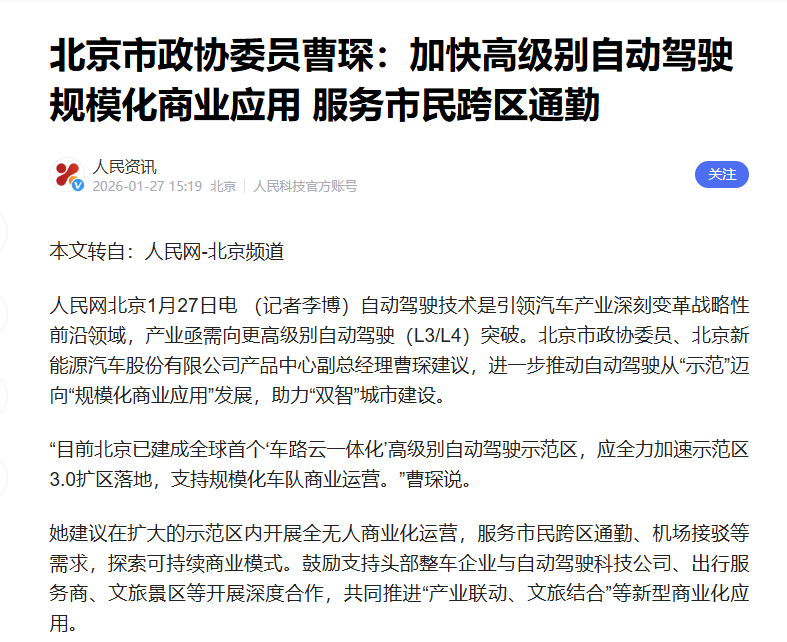 北京市政协委员曹琛:加快高级别自动驾驶规模化商业应用 服务市民跨区通勤