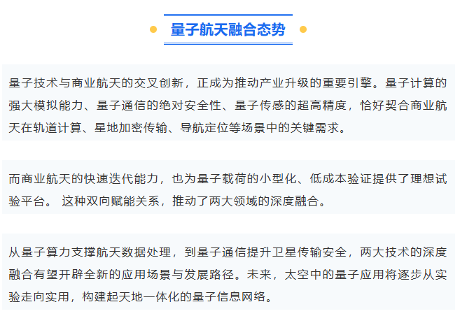 量子技术与商业航天的交叉创新,正成为推动产业升级的重要引擎。量子计算的强大模拟能力、量子通信的绝对安全性、量子传感的超高精度,恰好契合商业航天在轨道计算、星地加密传输、导航定位等场景中的关键需求。