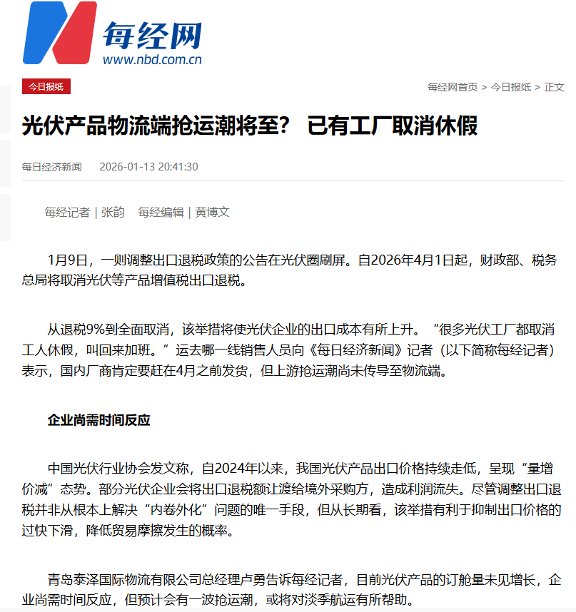 光伏产品物流端抢运潮将至? 已有工厂取消休假