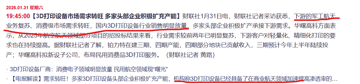 财联社1月31日电,财联社记者采访获悉,下游的军工航天业务复苏、消费级市场需求转旺,国内3D打印设备行业销售明显放量,多家头部企业积极扩产承接下游需求。华曙高科方面表示,从2025年航空航天领域部分项目的招投标结果来看,行业需求较前两年已明显复苏,下游客户对轻量化、精细化打印的要求也在持续提高。