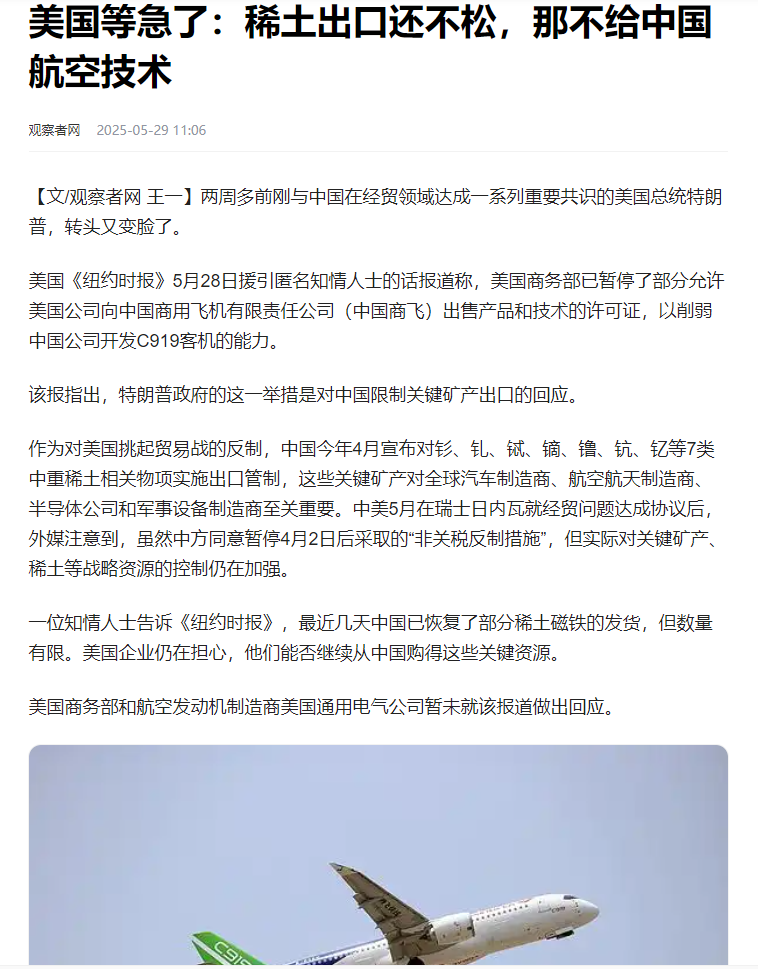 美国等急了:稀土出口还不松,那不给中国航空技术
