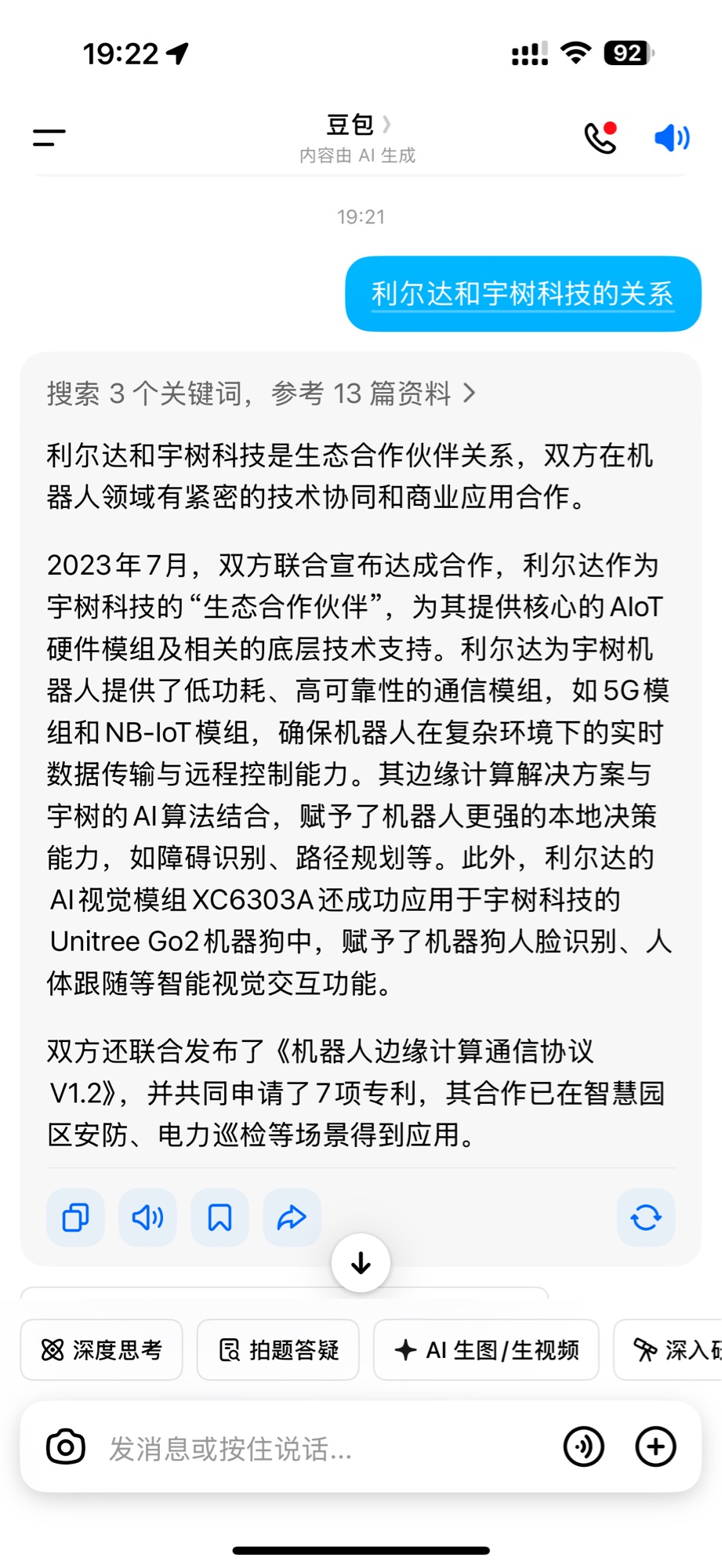 2023年7月,双方联合宣布达成合作,利尔达作为宇树科技的“生态合作伙伴”,为其提供核心的AIoT硬件模组及相关的底层技术支持。利尔达为宇树机器人提供了低功耗、高可靠性的通信模组,如5G模组和NB-IoT模组,确保机器人在复杂环境下的实时数据传输与远程控制能力。其边缘计算解决方案与宇树的AI算法结合,赋予了机器人更强的本地决策能力,如障碍识别、路径规划等。此外,利尔达的AI视觉模组XC6303A还成功应用于宇树科技的Unitree Go2机器狗中,赋予了机器狗人脸识别、人体跟随等智能视觉交互功能。