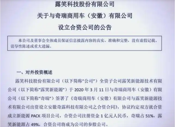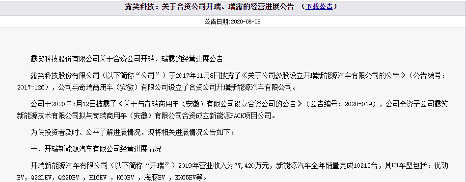 2、开瑞新能源汽车有限公司(奇瑞持股60%,露笑持股40%)负责新能源汽车销售
