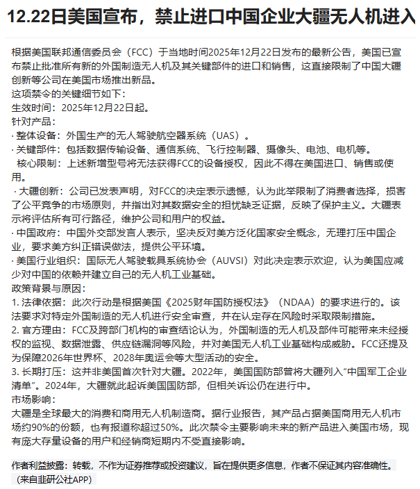 12.22日美国宣布,禁止进口中国企业大疆无人机进入市场