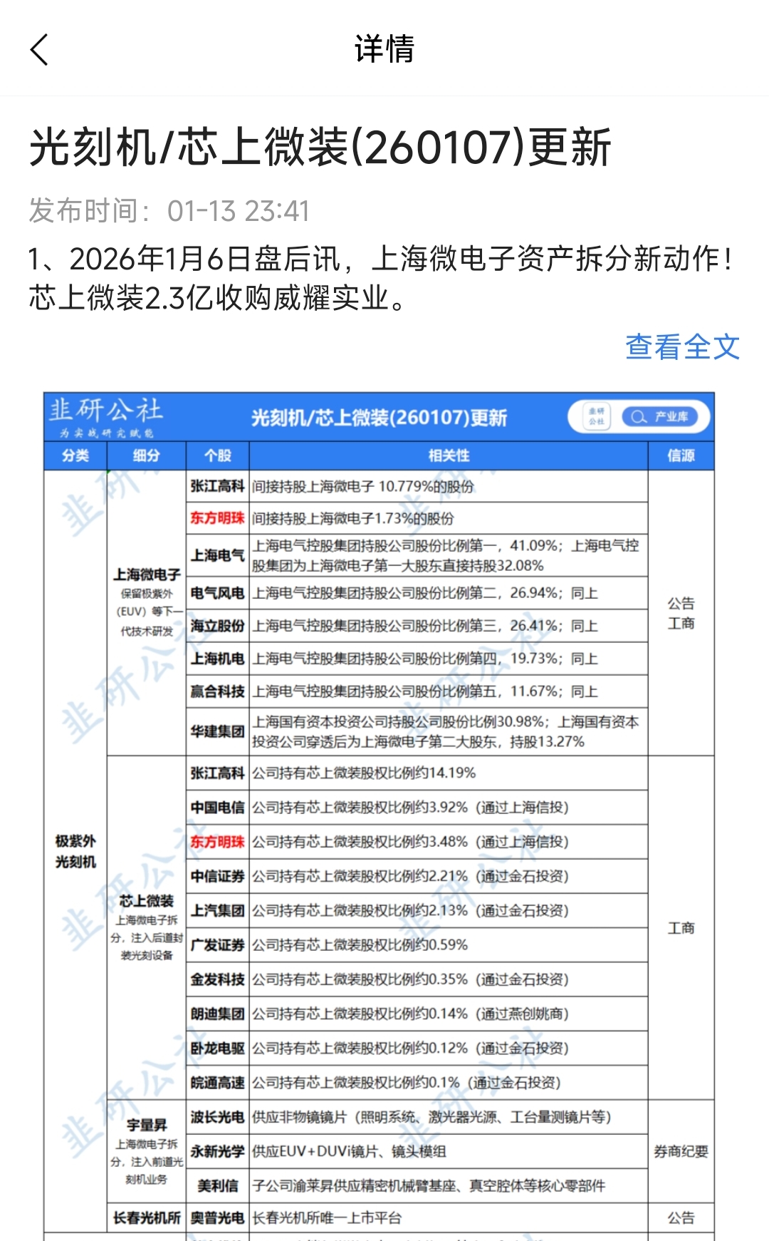 上海用原子造芯片路线图曝光:5年内靠全国产实现1纳米。芯上微装收购威耀实业,核心目的或在于整合上海微电子旗下相关资产,聚焦半导体装备核心业务的产业化落地。东方明珠还持有芯上微装3.48%