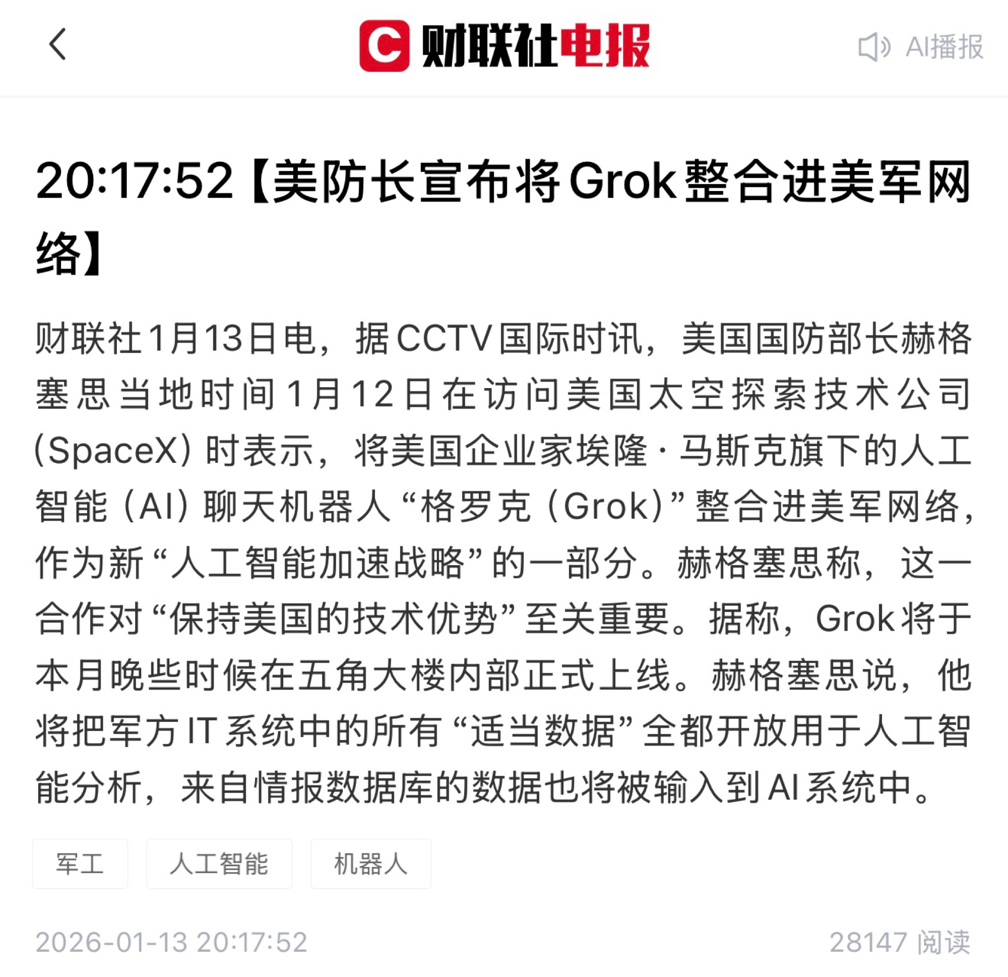 20:17:52【美防长宣布将Grok整合进美军网络】财联社1月13日电,据CCTV国际时讯,美国国防部长赫格塞思当地时间1月12日在访问美国太空探索技术公司(SpaceX)时表示,将美国企业家埃隆·马斯克旗下的人工智能(AI)聊天机器人“格罗克(Grok)”整合进美军网络,作为新“人工智能加速战略”的一部分。赫格塞思称,这一合作对“保持美国的技术优势”至关重要。据称,Grok将于本月晚些时候在五角大楼内部正式上线。赫格塞思说,他将把军方IT系统中的所有“适当数据”全都开放用于人工智能分析,来自情报数据库的数据也将被输入到AI系统中。