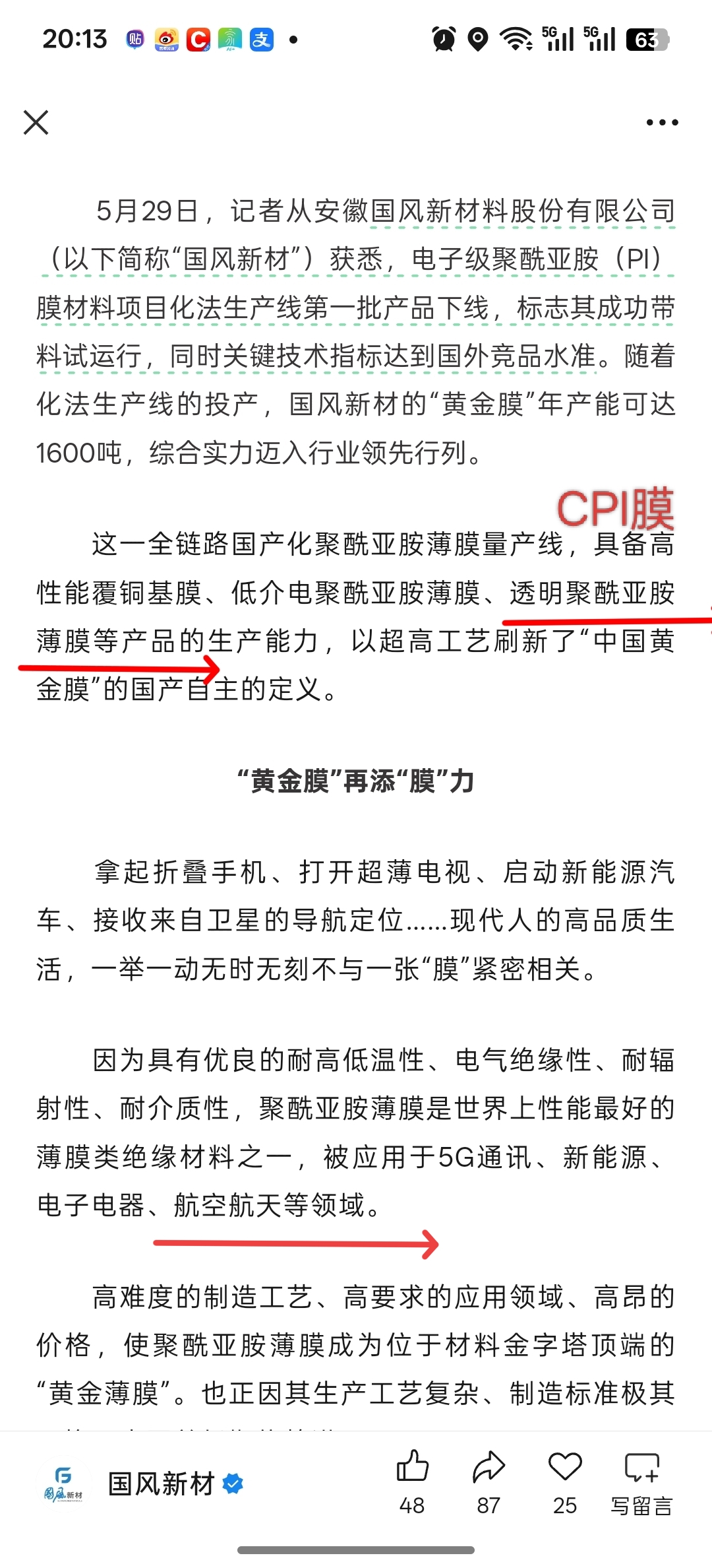 2025年国风新材官方公众号和合肥日报联合报导了国风新材透明聚酰亚胺膜(也就是CPI膜)的量产