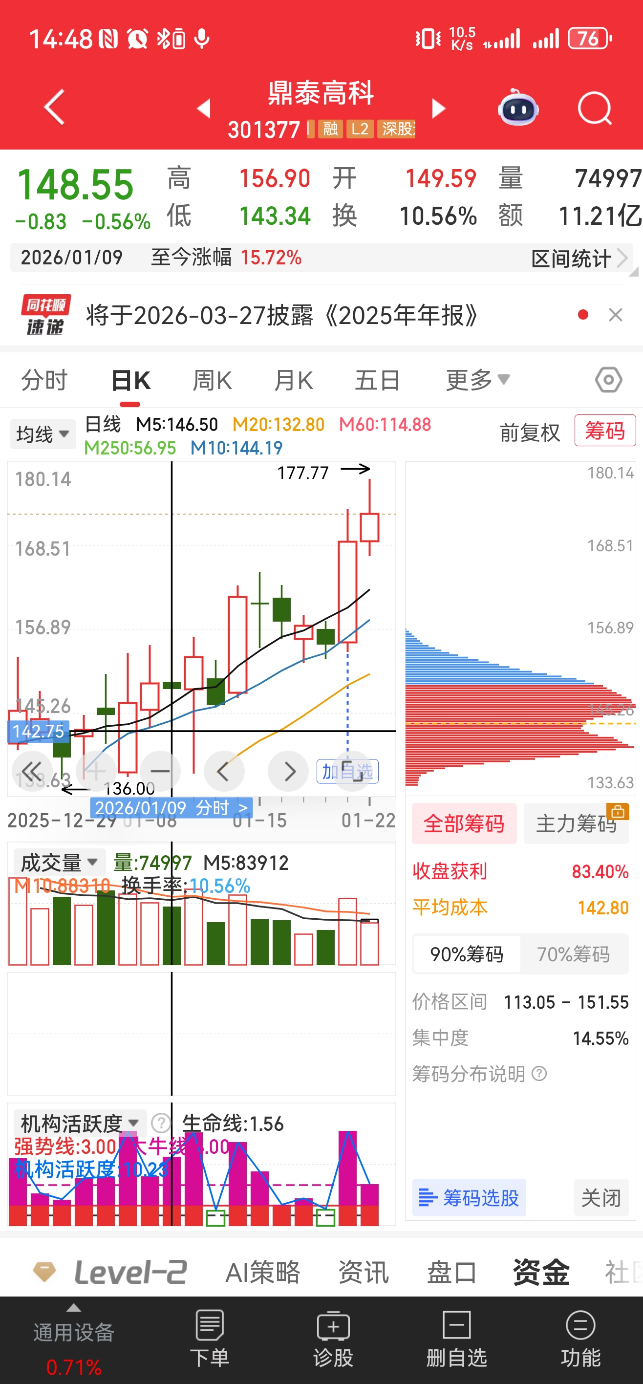 1月9日推的鼎泰高科,机构票的逻辑硬就是认准了,拿住了就一定会有收获148-177也没几天时间