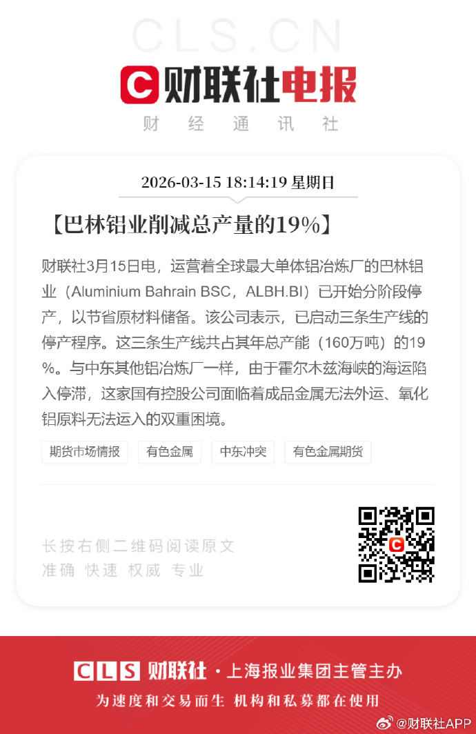 巴林铝业因霍尔木兹海峡航运中断,启动三条生产线(1、2、3号)的受控安全停产,合计削减年产能的19%(约30.78万吨),以应对原材料供应及成品出口的双重停滞。