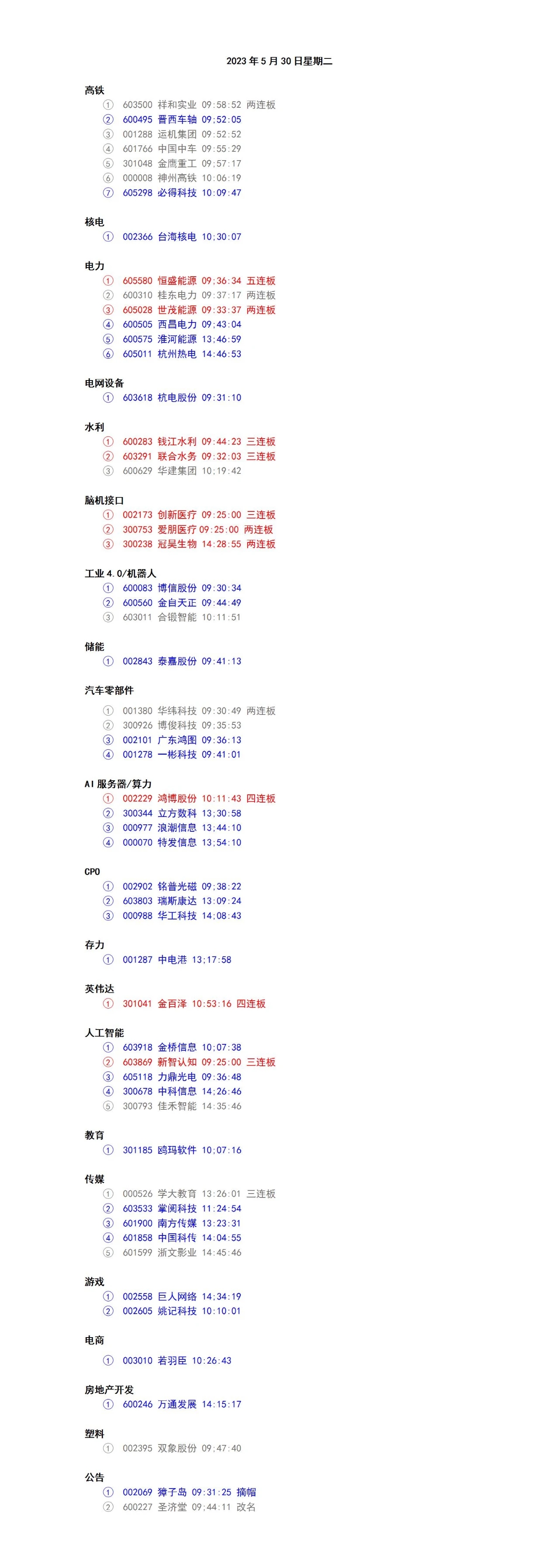 5月30日周二涨停板归类