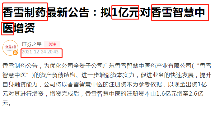 2021年3月,华盖医疗向香雪制药的孙公司香雪生命科学增资1亿元,占香雪生命科学股10.6383%。
