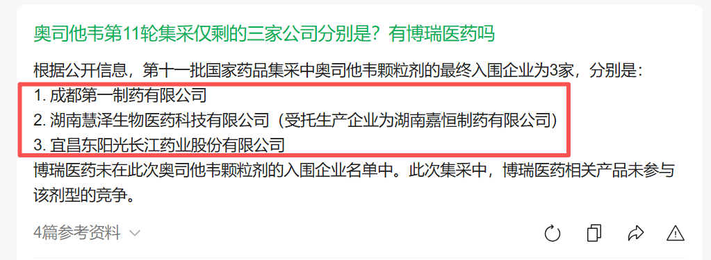 东阳光药的奥司他韦颗粒剂原本是医院报量需求最多的,全国共111.15万片。这次东阳光药落选,其市场份额将被中选的两家企业湖南慧泽生物、成都第一制药所瓜分。有消息称,两家企业的中选价格分别是17.88元和19.03元,而东阳光方面的报价远高于这两家。