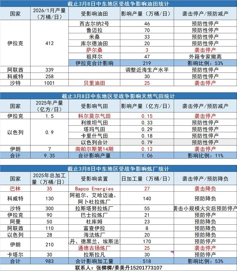 截止3月8日中东地区受战争影响油田统计