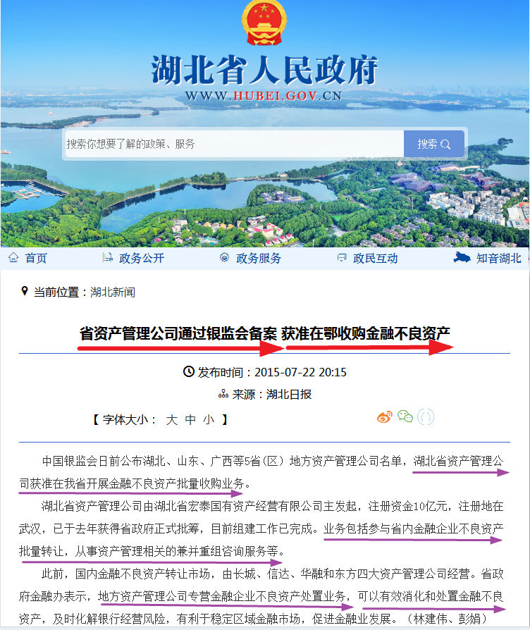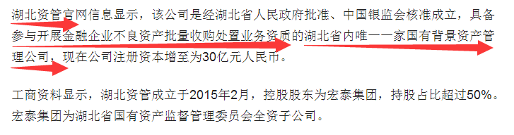 湖北资管官网信息显示,该公司是经湖北省人民政府批准、中国银监会核准成立,具备参与开展金融企业不良资产批量收购处置业务资质的湖北省内唯一一家国有背景资产管理公司。