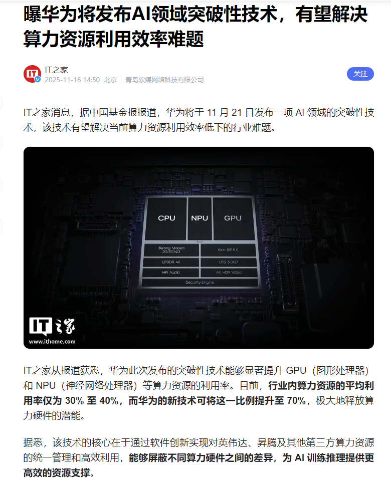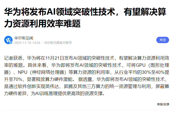 曝华为将发布AI领域突破性技术,有望解决算力资源利用效率难题