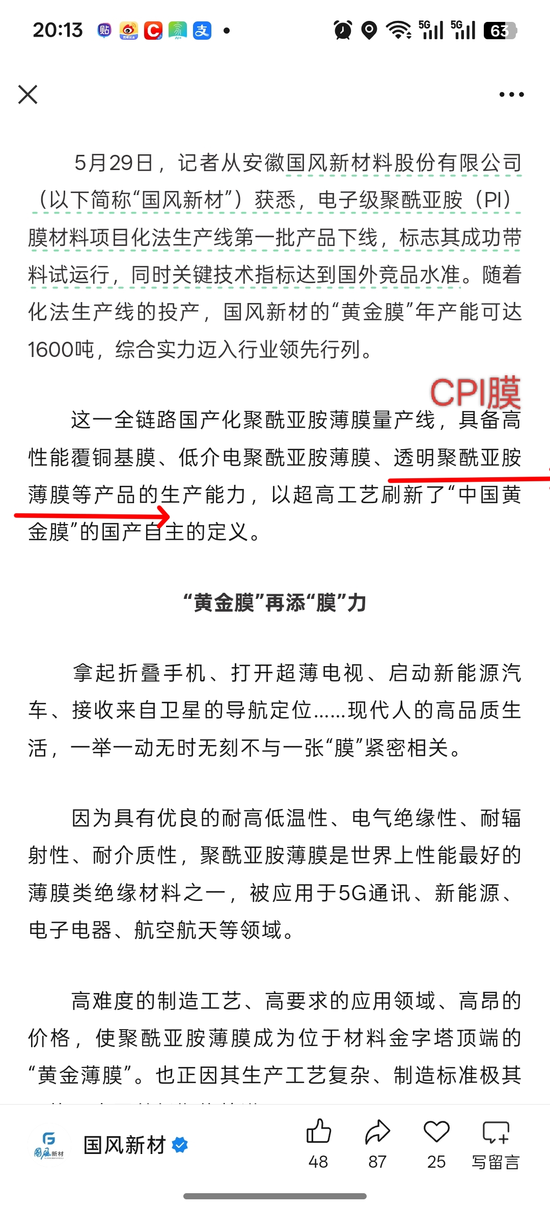 2025年国风新材官方公众号和合肥日报联合报导了国风新材透明聚酰亚胺膜(也就是CPI膜)的量产