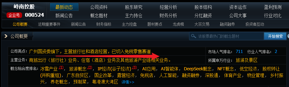 旅游老龙:岭南控股:广州国资委旗下,主营旅行社和酒店经营,已切入免税零售赛道