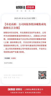 【市北高新:公司间接参股沐曦集成电路和长江存储】财联社9月30日电,市北高新在互动平台表示,公司作为央视融媒体基金的有限合伙人,占基金2.69%份额。央视融媒体基金于2022年6月投资沐曦集成电路(上海)股份有限公司,于2023年12月投资长江存储控股股份有限公司。(来自财联社APP)一、半导体与算力赛道火热,市北高新凭参股优势崭露头角 在科技浪潮的推动下,半导体和算力领域成为近期市场焦点。 9 月 30 日,财联社消息传来,市北高新(600604.SH)在互动平台表示,公司作为央视融媒体基金的