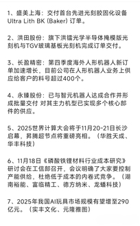 盘中发酵 1、MMLC电池级碳酸锂(早盘)价格较昨日上涨1700元/吨。 英伟达公布第四季营收预测远高于华尔街预期,首席执行官黄仁勋称来自大型云服务商的人工智能(AI)芯片需求强劲。易中天高开低走 安徽新远科技有限公司一车间起火,新远科技具备年产5万吨环氧树脂活性稀释剂的生产能力,全球市场占有率超过20%。宏昌电子 据媒体报道,日企佳能、尼康、三菱化学等中止向中国大陆客户提供光刻胶材料与光刻机维修服务。中国大陆超过六成光刻胶由日企供应。彤程新材 英伟达与人形机器人关键合作伙伴富士害携手,双方合作
