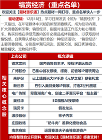 特别提示:下文涉及的题材或公司,内容罗列和篇幅长短,与后续涨跌无关,亦均非进行推荐,仅作研究辅助。投资者应自主决策,注意风险。 一、市场热点 犒赏经济:拉动内需新引擎 ◇驱动:2025年12月17日,《学习时报》发表文章《何为“犒赏经济”》指出,一种被称为“犒赏经济”的新型消费模式在年轻群体中悄然兴起并迅速发展,成为拉动内需、扩大消费的新引擎。 ◇犒赏经济:指消费者在面对工作生活压力或特定的心理需求时,通过购买价格在承受范围内的非必需品或体验服务,以获取即时性愉悦感、自我确认感和心理疗愈的一种经