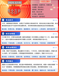 特别提示:下文涉及的题材或公司,内容罗列和篇幅长短,与后续涨跌无关,亦均非进行推荐,仅作研究辅助。投资者应自主决策,注意风险。 一、市场热点 太空算力:巨头加速布局,大国竞赛开始 ◇驱动:1)2025年11月27日,北京拟在700-800公里晨昏轨道建设运营超过千兆瓦(GW)功率太空AI算力数据中心系统,计划2025年至2027年迭代研制试验星建设一期算力星座,2031年至2035年,卫星大规模批量生产并组网发射,在轨对接建成大规模太空数据中心。 2)2025年11月,马斯克(未来4至5年每年部