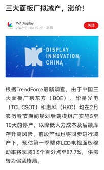 ,京东方A 关注 20cm 长信科技 WITSVIEW面板报价符合预期: 1️⃣12月洛图和大摩都预言今年Q1 TV面板将小幅度上涨,但NB面板因为内存续涨导致下游笔电品牌压价——潜在降价,今日WITSVIEW报价符合预期。 TV面板全线出现小幅度涨价,32-65寸四款TV面板都微涨1美元,MNT面板报价持平,NB面板则各有两款微跌0.2美元。 2️⃣12月3日、即上月5日WITSVIE