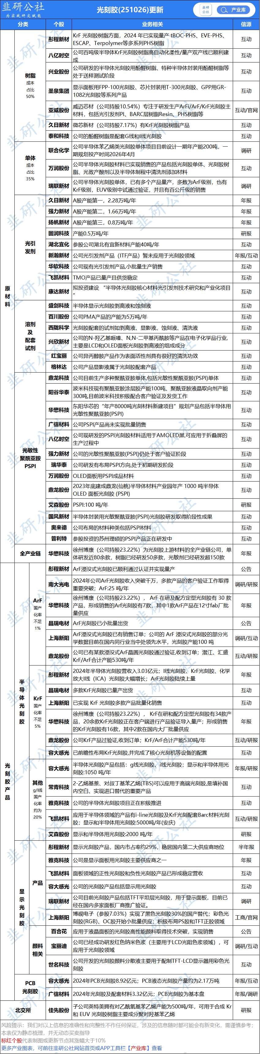 、飞凯材料等光刻胶龙头建立稳定合作,同步受益于下游