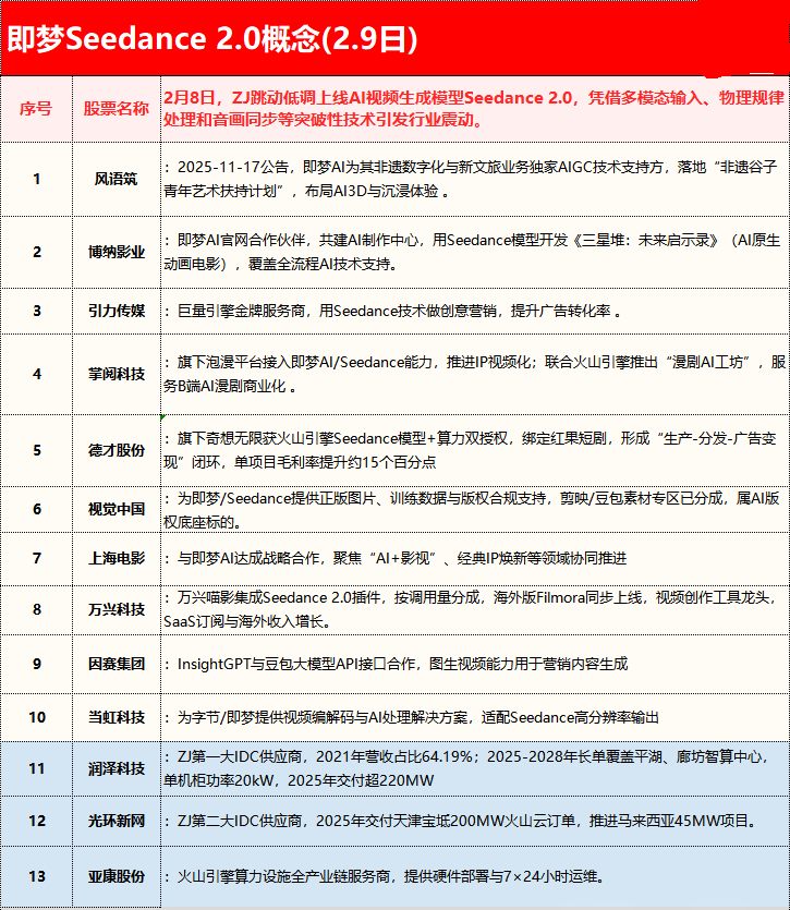 特别提示:下文涉及的题材或公司,内容罗列和篇幅长短,与后续涨跌无关,亦均非进行推荐,仅作研究辅助。投资者应自主决策,注意风险。 一、机会前瞻 字节:多模态模型完成重磅更新 ◇事件:2026年2月7日,字节跳动旗下多模态模型Seedance 2.0完成重磅版本更新。 ◇技术升级:1)角色与场景的一致性质变,在多镜头连续生成中,主体特征保持高度稳定,为AI视频从“短视频素材”走向“叙事性长内容”关键门槛。 2)复杂的物理动态模拟:在处理大幅度动作(奔跑、打斗)及光影流转时,物理规律的遵循度显著提升,