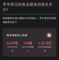 黄金储备构成与价值 截至2024年末,萃华珠宝的黄金储备约为 6.01吨 ,按当时采购成本计算,账面价值约为 27.8亿元 ,平均采购成本约为462.6元/克。 而根据2025年中期财报,黄金类存货占比高达87.24%,金额约为29.81亿元。 董秘办确认,截至2025年中期,公司黄金库存约为 6吨多 ,均为现货黄金,主要采购渠道为上海黄金交易所。 黄金价值与市值对比 以2026年1月29日的黄金现货价格约1240元/克计算,萃华珠宝的黄金储备价值已升至约 75亿元 。 而公司当时总市值仅约36