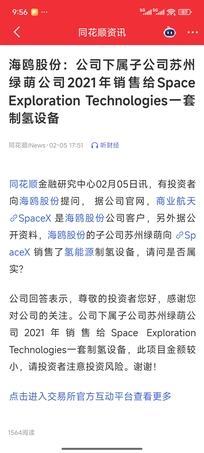 金融研究中心02月05日讯,有投资者向海鸥股份提问, 据公司官网,商业航天 SpaceX 是海鸥股份公司客户,另外据公开资料,海鸥股份的子公司苏州绿萌向 SpaceX 销售了氢能源制氢设备,请问是否属实? 公司回答表示,尊敬的投资者您好,感谢您对公司的关注。公司下属子公司苏州绿萌公司2021年销售给Space Exploration Technologies一套制氢设备,此项目金额较小,请投
