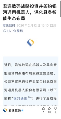 数据显示,入选理由是:2026年2月4日公告,光宏精密在光通信相关业务的布局,主要围绕核心光学产品展开,重点研发适配光通信场景的微透镜阵列、高精度光学组件等,可用于光模块、光传输设备的信号准直与调控环节。目前相关产品处于技术优化与小批量场景适配阶段,与公司数据通信业务形成协同支撑。 2. 银河通用机器人: 近日,君逸数码在机器人及具身智能领域的战略布局取得重要进展。公司不仅已通过产业基金对北